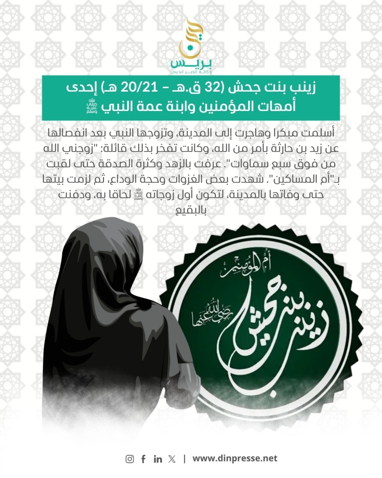 زينب بنت جحش رضي الله عنها، من أمهات المؤمنين، تزوجها النبي ﷺ بأمر من الله بعد طلاقها من زيد بن حارثة، وعرفت بالزهد والصدقة.