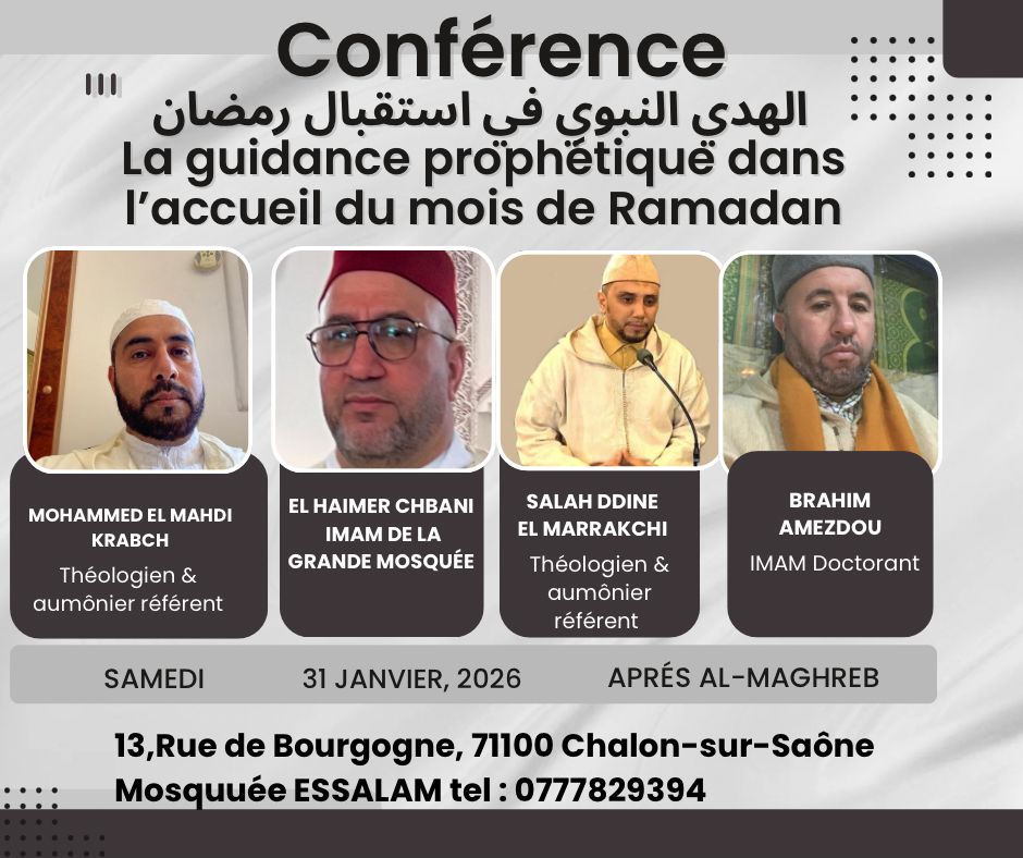 دين بريس في إطار خدمة السيرة النبوية وتنظيم ملتقى تواصلي ديني تحت عنوان: «المنهج النبوي في استقبال رمضان»، رحّب السيد عبد الكبير حسكة، رئيس المركز الإسلامي بمسجد السلام، مدينة Chalon sur sône ( 71) الفرنسية. رفقة الإمام السيد الشباني الحيمر، بالأساتذة الأئمة المحاضرين: • الأستاذ محمد المهدي اقرابش • الأستاذ إبراهيم أمزضاو • الأستاذ صلاح […]