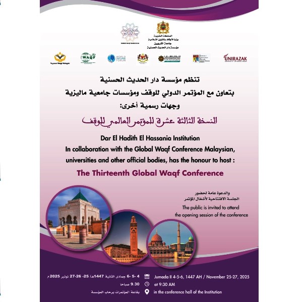 تنظم مؤسسة دار الحديث الحسنية، بشراكة مع المؤتمر الدولي للوقف ومؤسسات جامعية ماليزية وجهات رسمية مختلفة، الدورة الثالثة عشرة من المؤتمر العالمي للوقف خلال أيام 25 و26 و27 نونبر 2025، الموافق لـ 4 و5 و6 جمادى الثانية 1447هـ، وذلك بالعاصمة الرباط. ويأتي هذا الحدث العلمي لتعزيز النقاش حول التطورات التي تعرفها منظومة الوقف في العالم […]