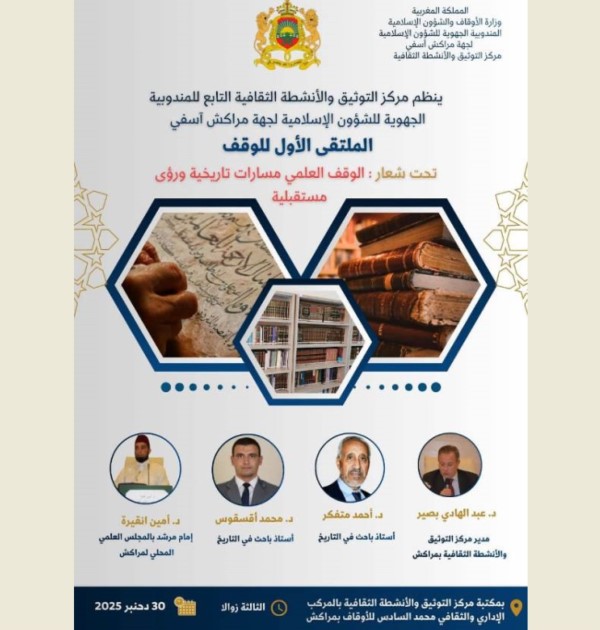 أحمد المهداوي/مراكش يستعد مركز التوثيق والأنشطة الثقافية، التابع للمندوبية الجهوية للشؤون الإسلامية لجهة مراكش–آسفي، لتنظيم الملتقى الأول للوقف تحت شعار: «الوقف العلمي: مسارات تاريخية ورؤى مستقبلية»، وذلك يوم الثلاثاء 30 من الشهر الجاري، بمكتبة مركز التوثيق والأنشطة الثقافية. ويشارك في هذا الملتقى العلمي المتميز نخبة من الأكاديميين والباحثين الدكتور عبد الهادي بصير، مدير مركز التوثيق […]