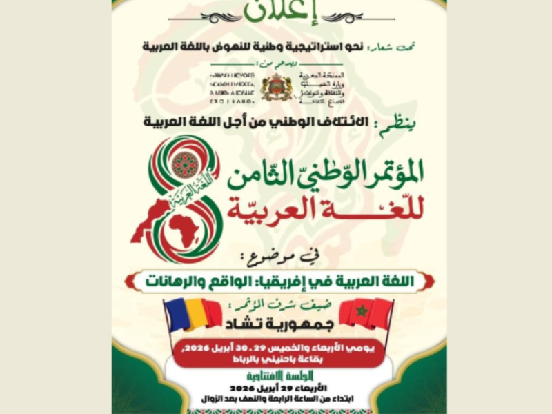 ينظم الائتلاف الوطني من أجل اللغة العربية، يومي الأربعاء والخميس 29 و30 أبريل 2026، بقاعة باحنيني في الرباط، المؤتمر الوطني الثامن للغة العربية، تحت شعار: “نحو استراتيجية وطنية للنهوض باللغة العربية”، وفي موضوع “اللغة العربية في إفريقيا: الواقع والرهانات”. وينعقد هذا المؤتمر بشراكة مع وزارة الشباب والثقافة والتواصل، قطاع الثقافة، وأكاديمية المملكة المغربية، والمنظمة العربية […]